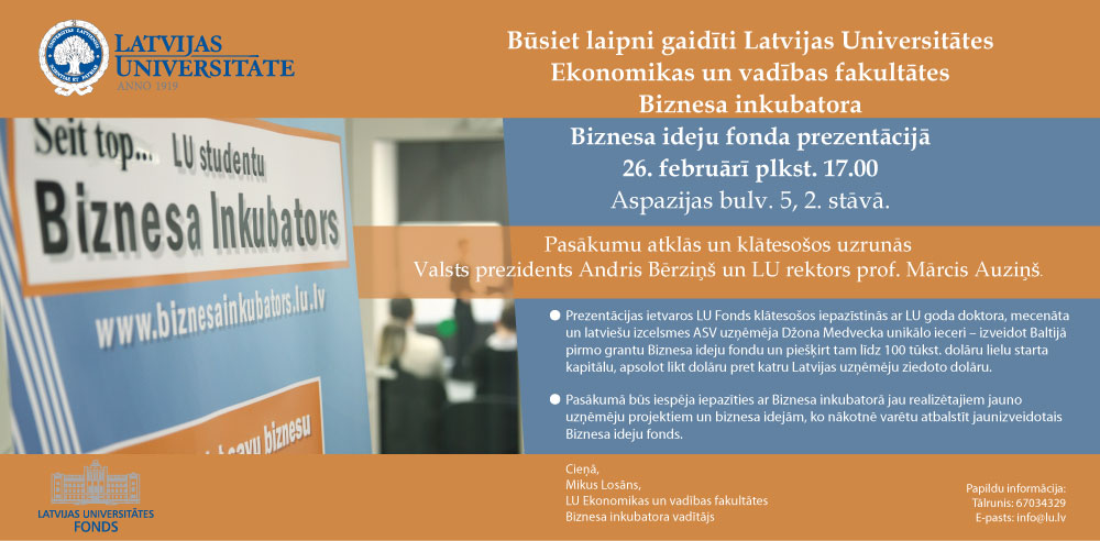 Ja esi jau apmeklējis Biznesa Inkubatora vieslekciju 19.februārī un vēlējies tuvāk iepazīties ar Biznesa Inkubatorā jau īstenotajiem studentu projektiem, 26. februārī plkst. 17:00 Aspazijas bulvārī 5, 2.stāvā būs uzstāsies šo projektu iniciatori un vadītāji!