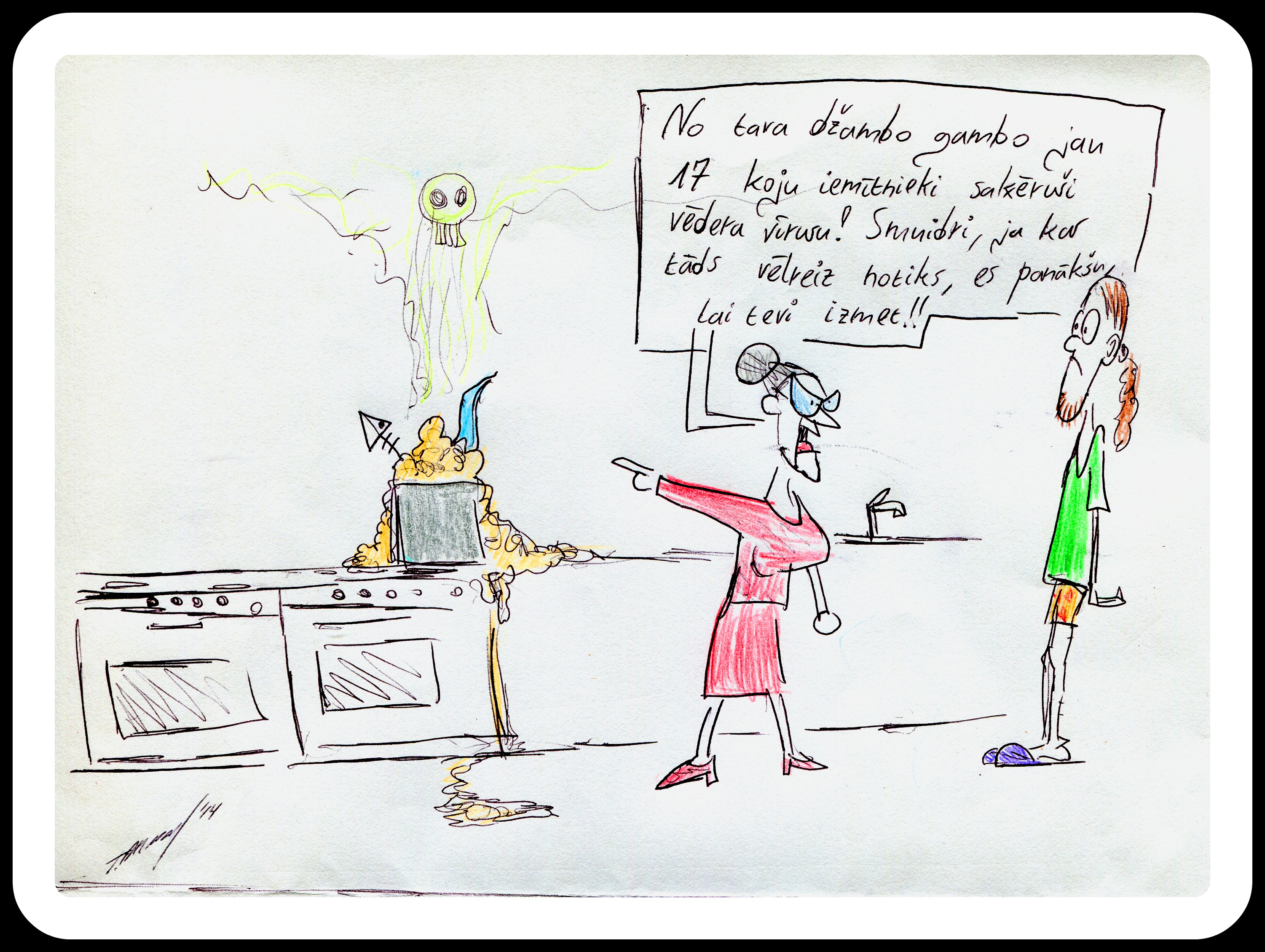 Karikatūras lieku reizi atgādina, ka, gatavojot ēdienu, jāraugās, lai ēdiens nepāriet pāri katla vai pannas malām un, ja tas tā noticis, aiz sevis jāsakopj; ka atkritumus drīkst mest tikai tiem paredzētā urnā un atkritumus no istabiņām studenti var paši aiznest līdz konteinerim, nevis tos atstāt koplietošanas telpās; ka, izmantojot koplietošanas telpu izlietnes, jāskatās, lai tās netiktu aizsprostotas ar jebkāda veida pārtikas vai sadzīves atkritumiem, bet, ja aizsprostojas, jāatrisina problēma; ka pēc nokārtošanās tualetes klozetpodā obligāti jānolaiž ūdens un mazgājoties dušas kabīnē, saudzīgi jāizturas pret dušas inventāru, kā arī regulāri jāsakopj sava istabiņa. Liekas, pašsaprotamas lietas, bet dažkārt saspringtajā studiju procesā students par šīm lietām piemirst.