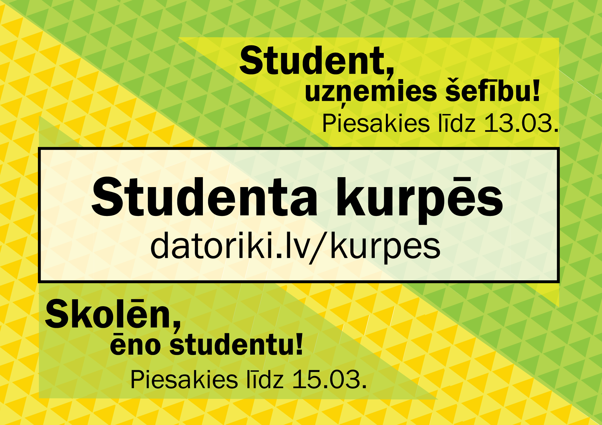 Student, ja Tu vēlies iedvesmot kādu vidusskolēnu turpināt mācības, kā arī godam nest savas augstskolas vārdu pasaulē, tad nenokavē un piesakies http://www.lu.lv/gribustudet/pasakumi/studijas/studentakurpes/studentiem/ līdz 13. martam. Baumo, ka Tavs darbs būs īpaši novērtēts.