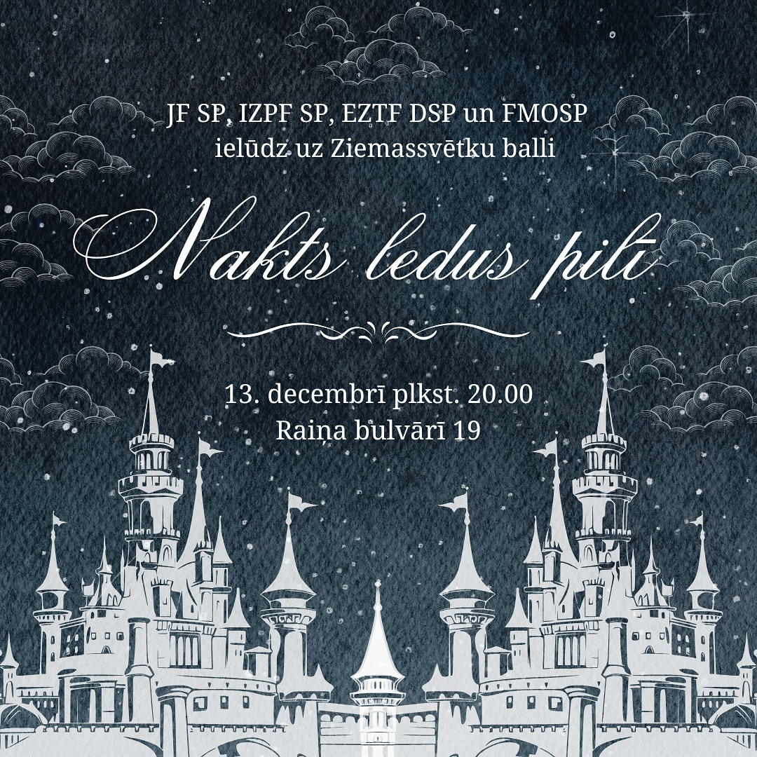 Naktīm kļūstot garākām un zemei kļūstot baltākai, Latvijas Universitātes Juridiskās fakultātes, Izglītības zinātņu un psiholoģijas fakultātes, Eksakto zinātņu un tehnoloģiju fakultātes Datorikas un Fizikas, matemātikas un optometrijas studējošo pašpārvaldes ielūdz uz gada gaidītāko pasākumu – Ziemassvētku balli.